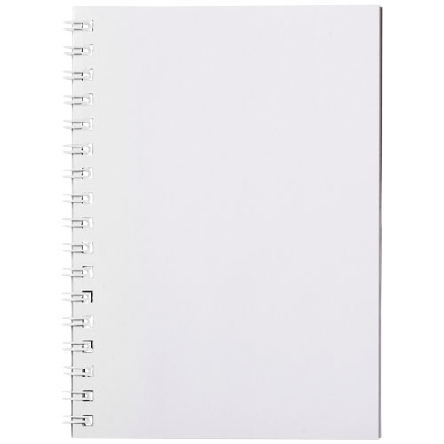 Desk-Mate® spiral A6 notebook. Includes 50 blank sheets of 80g/m2 paper, a glossy card front cover (250 g/m2) and a 450 micron transparent polypropylene cover. Black or white wire. Full colour print available to card cover and each sheet.