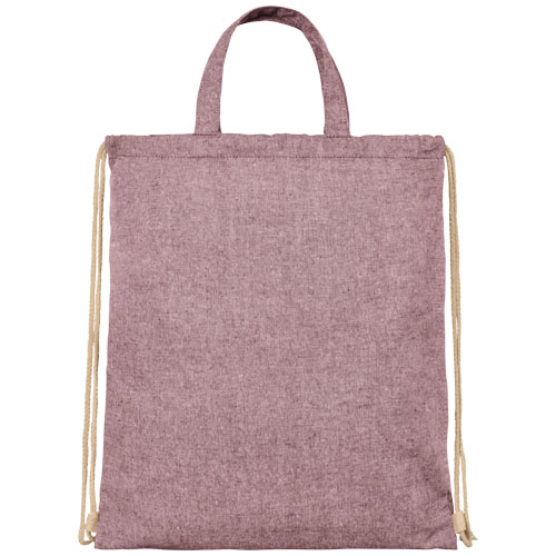 Drawstring backpack made of 210 g/m² recycled cotton polyester blend. Recycled cotton is manufactured from pre-consumer waste generated by textile factories during the cutting process. Large main compartment with cotton drawstring closure. Features two handles with a dropdown height of 14 cm. Resistance up to 5 kg weight.